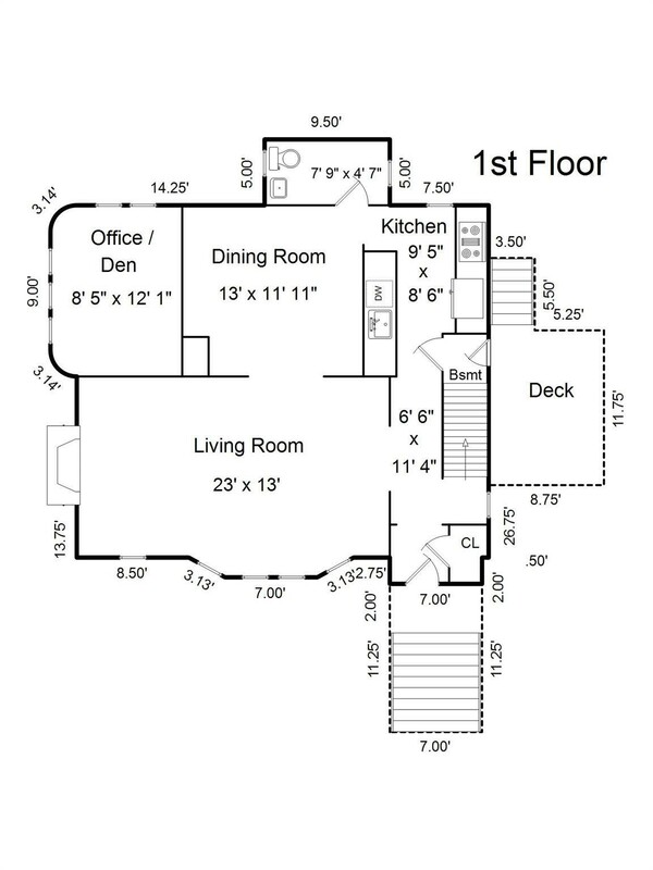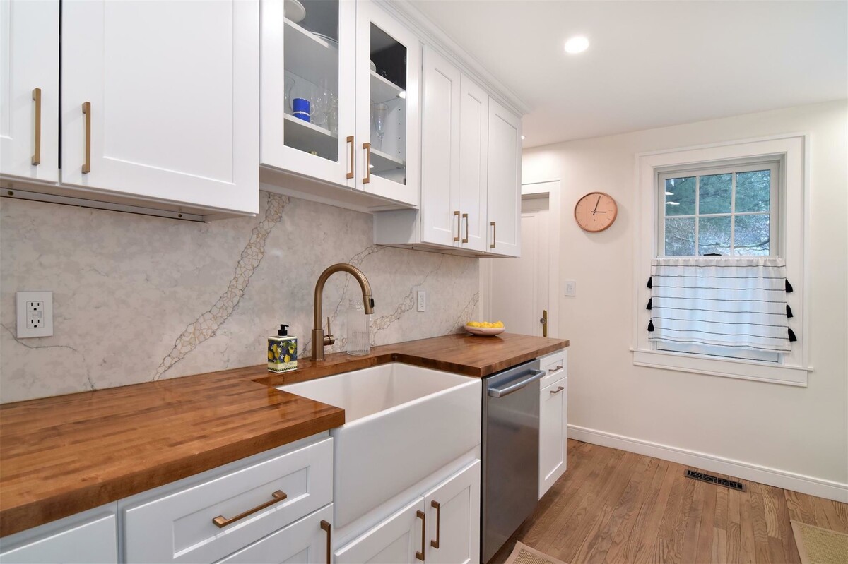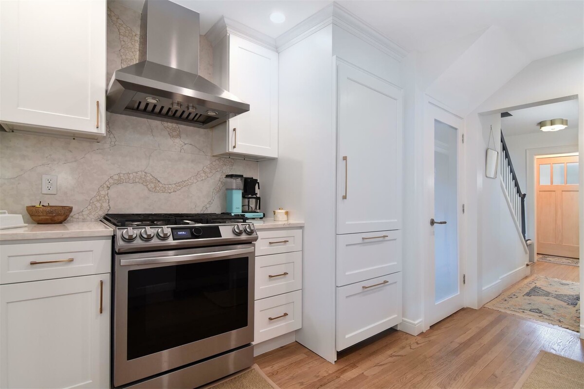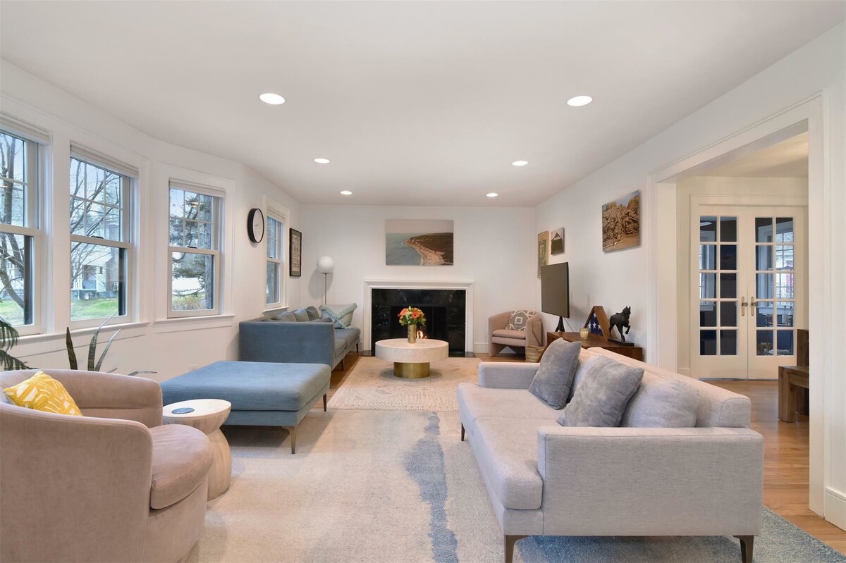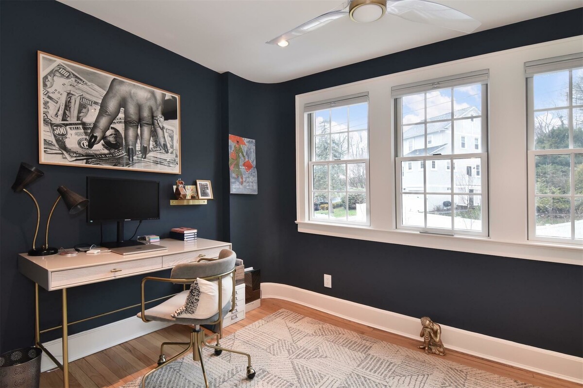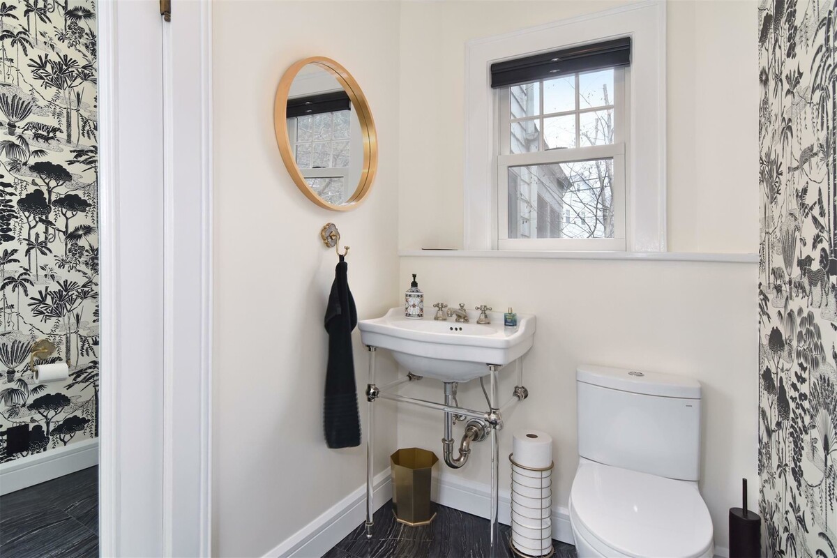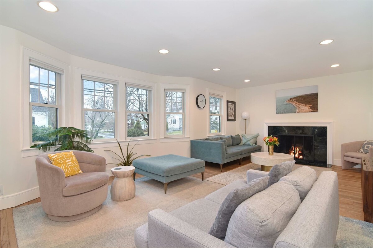 MAIN FLOOR: ● Entry vestibule with coat closet & new front door ● Living room with high hat lighting, hrdwd flrs, bow window & fplc ● Formal dining room with hardwood floors ● French doors to office-den w/hdwd flrs, five windows & ceiling fan ● Gourmet kitchen with high hat lighting, Samsung smart range/oven & commercial-style exhaust hood, top-of-the-line Liebherr refrigerator, Bosch dishwasher, farmhouse sink, butcher block & marble counters, marble backsplash, hdwd flrs & door to deck ● Recently remodeled powder room ● Outdoor deck