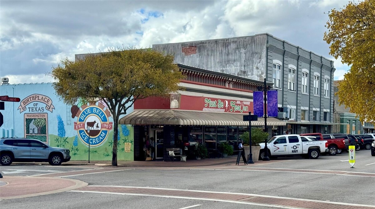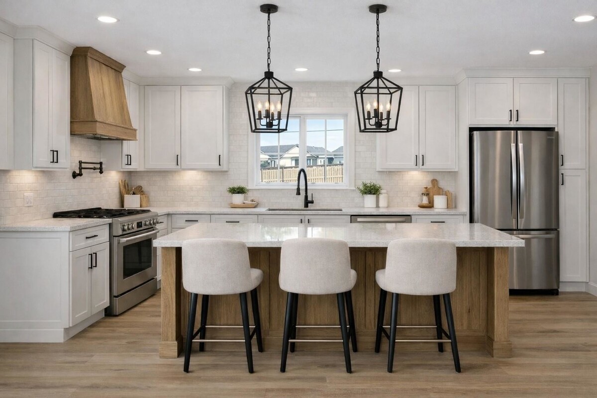 This 3-bed+Study farmhouse-style home in Brenham features vaulted ceilings, luxury wood-look plank flooring, and a gas fireplace with a stone surround. The open-concept kitchen includes site-built cabinetry, under-cabinet lighting, tile backsplash, pot filler, and a large island designed for prep and gathering.